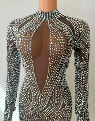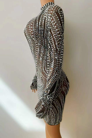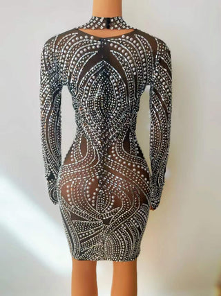 Dazzling Sheer Long-Sleeve Mini Dress with Intricate Crystal Patterns