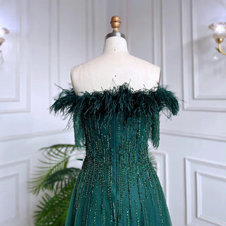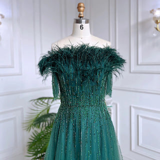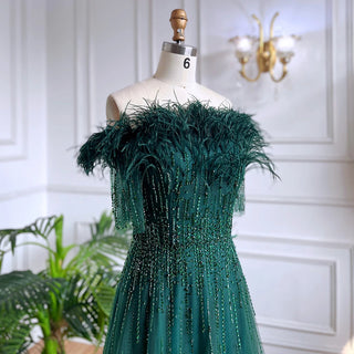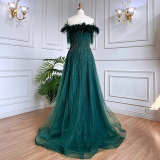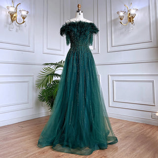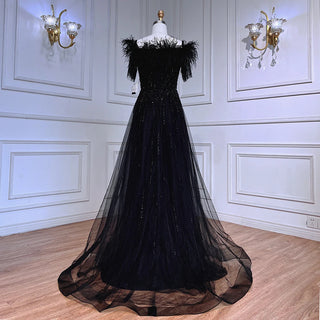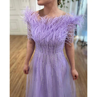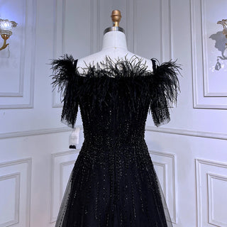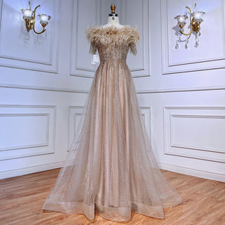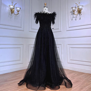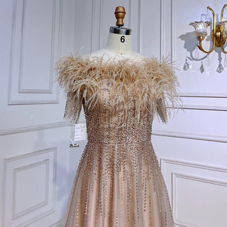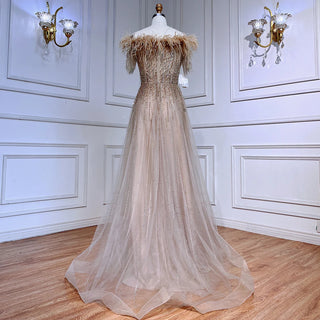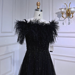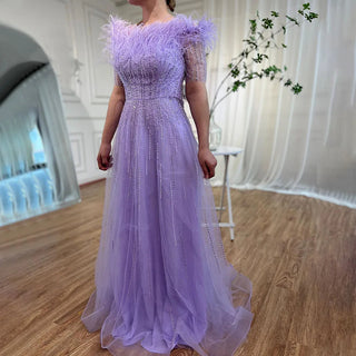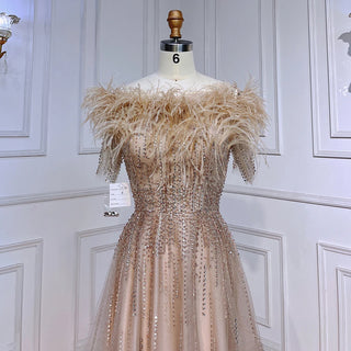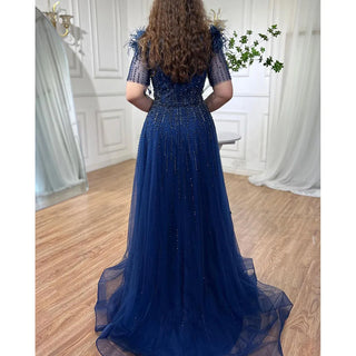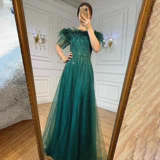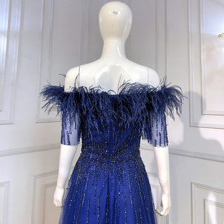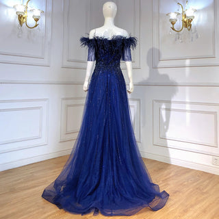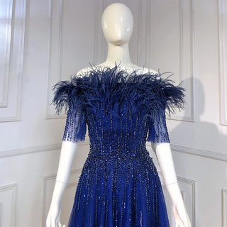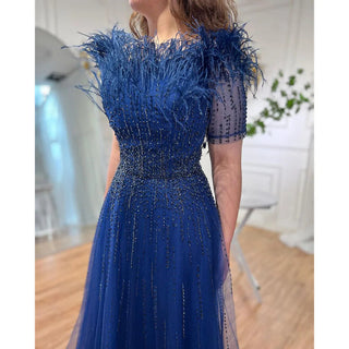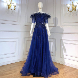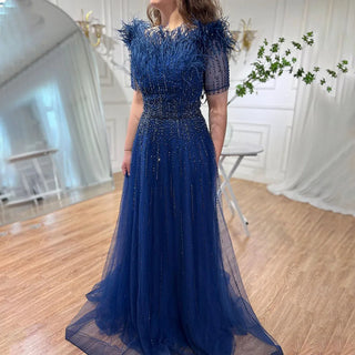 Blue Serenity: 2025 Boat Neck Luxury Evening Gown - Short Sleeves Beaded Feather A-Line Dress for Women's Party